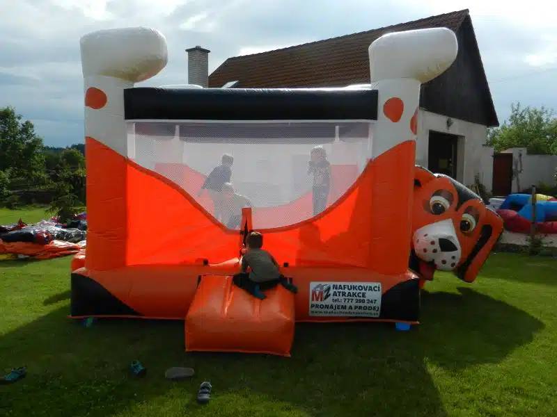 Máme pro vás k zapůjčení nafukovací skákací hrad Velký pes. Tento skákací hrad je dostatečně velký a určitě udělá radost dětem, které budou chtít na něm skotačit. Skákací hrad Velký pes je 450 cm vysoký, široký 400 cm a jeho délka je 500 cm.