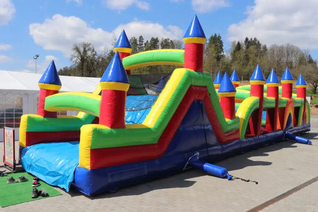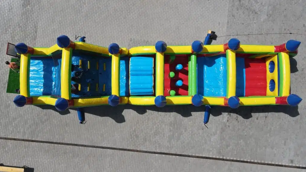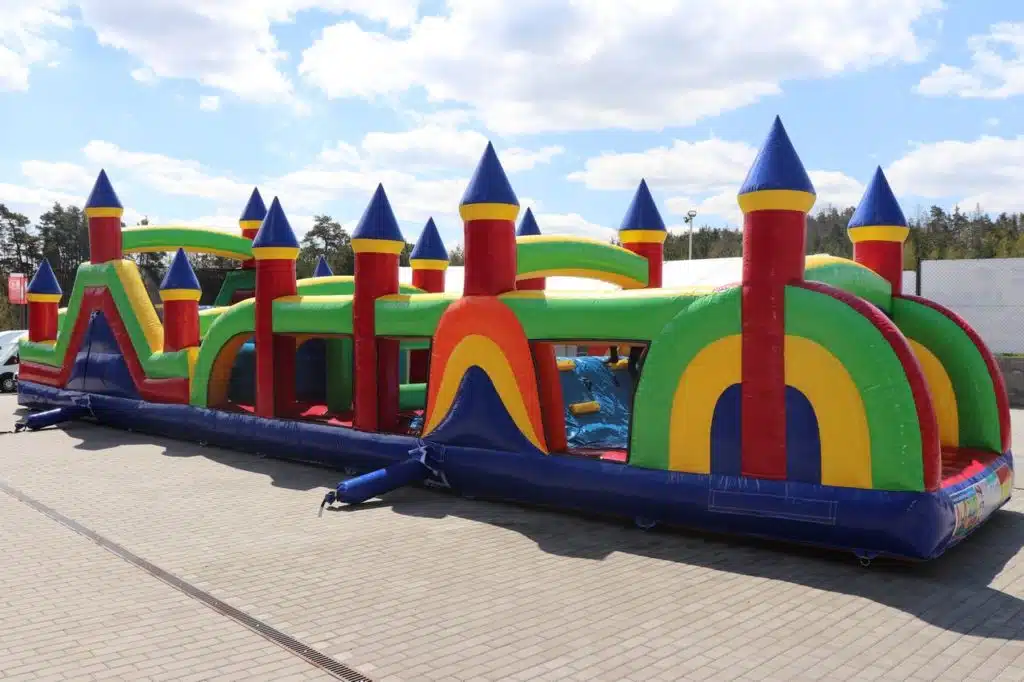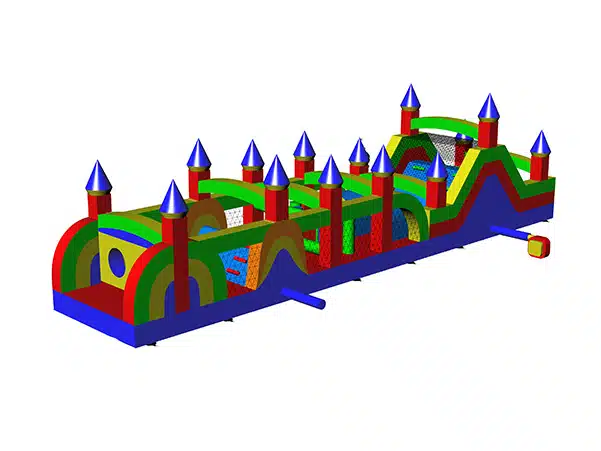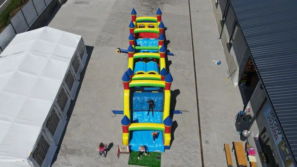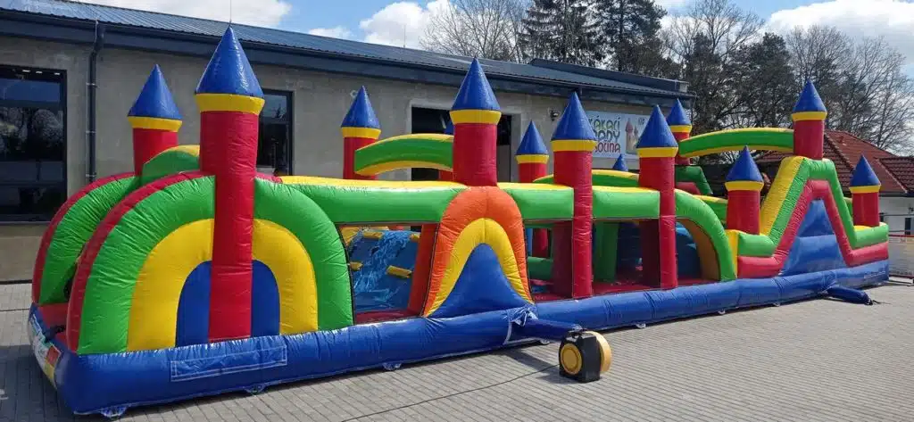 Půjčujeme velký nafukovací skákací a prolézací hrad DIVOKÁ DRÁHA (extra maxi). Tento nafukovací hrad udělá radost každému neposednému dítku. Hrad poskytuje mnoho možností pro skotačení.