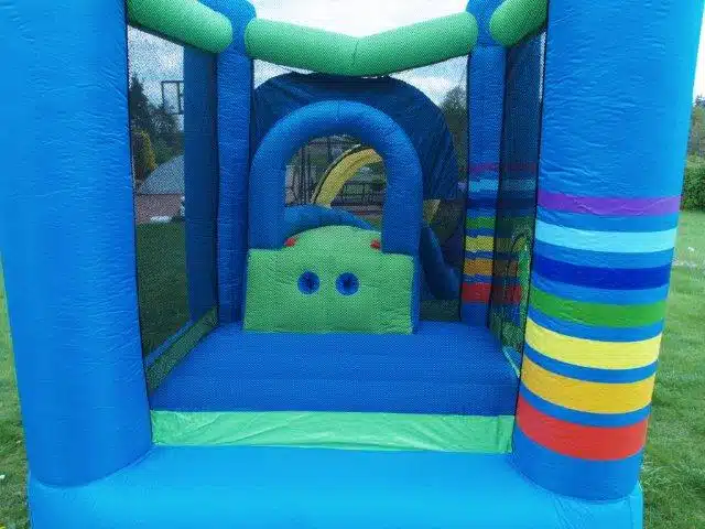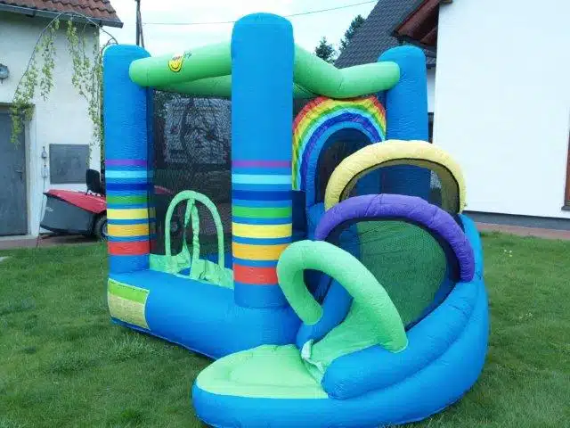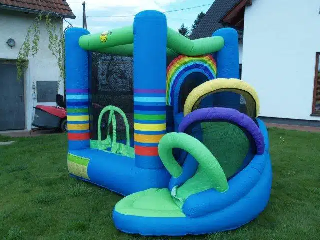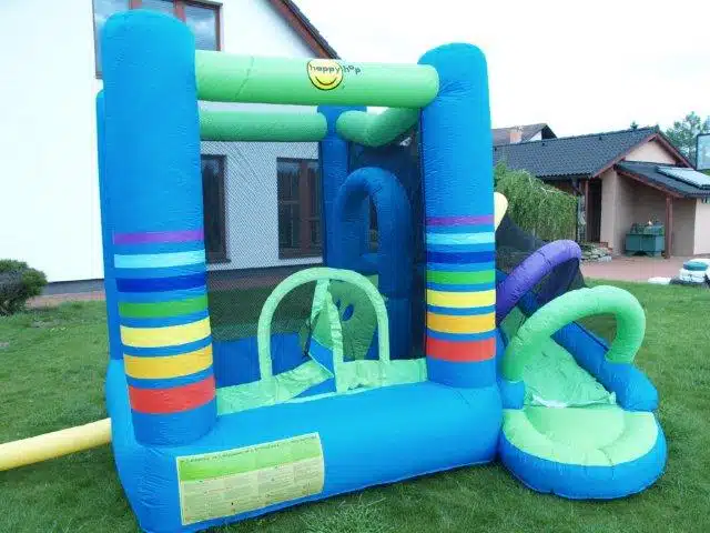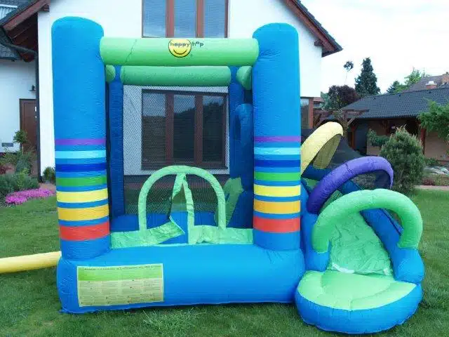 Nafukovací skákací hrad DUHA nabízí ke skotačení skluzavku a velkou skákací plochu. Nafukovací hrad je značky Happy Hop, což je známka kvality.